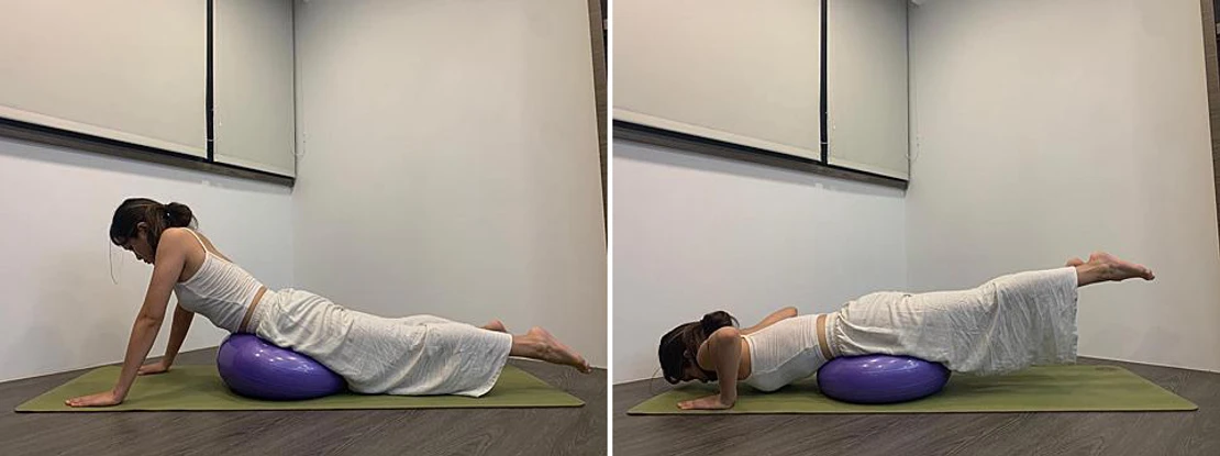 1.雙膝跪在球上,手臂向前打直,頭部與軀幹平行,伸展背部。
