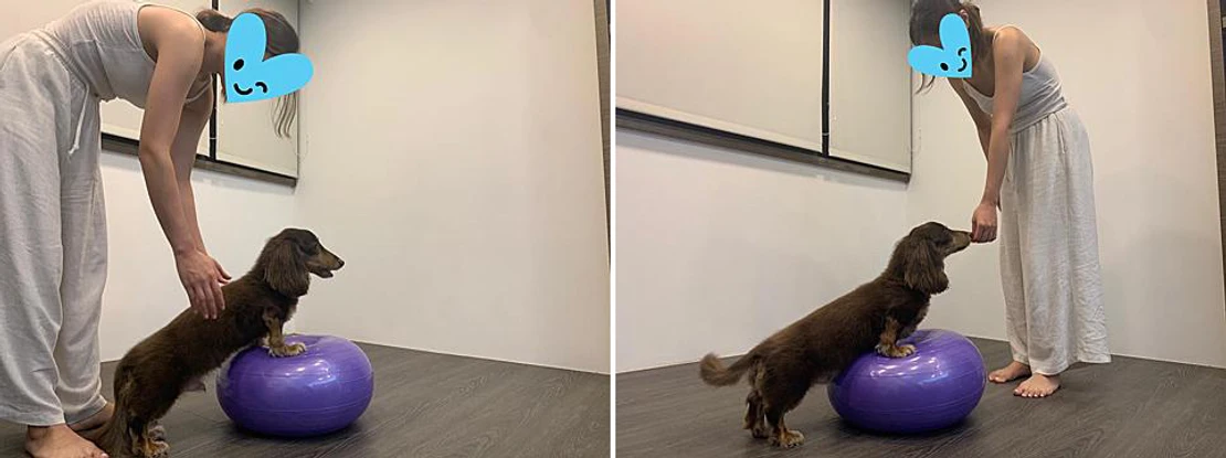 訓練狗狗前腳踩踏平衡地站在球上,可以給予一點小零食做獎勵。