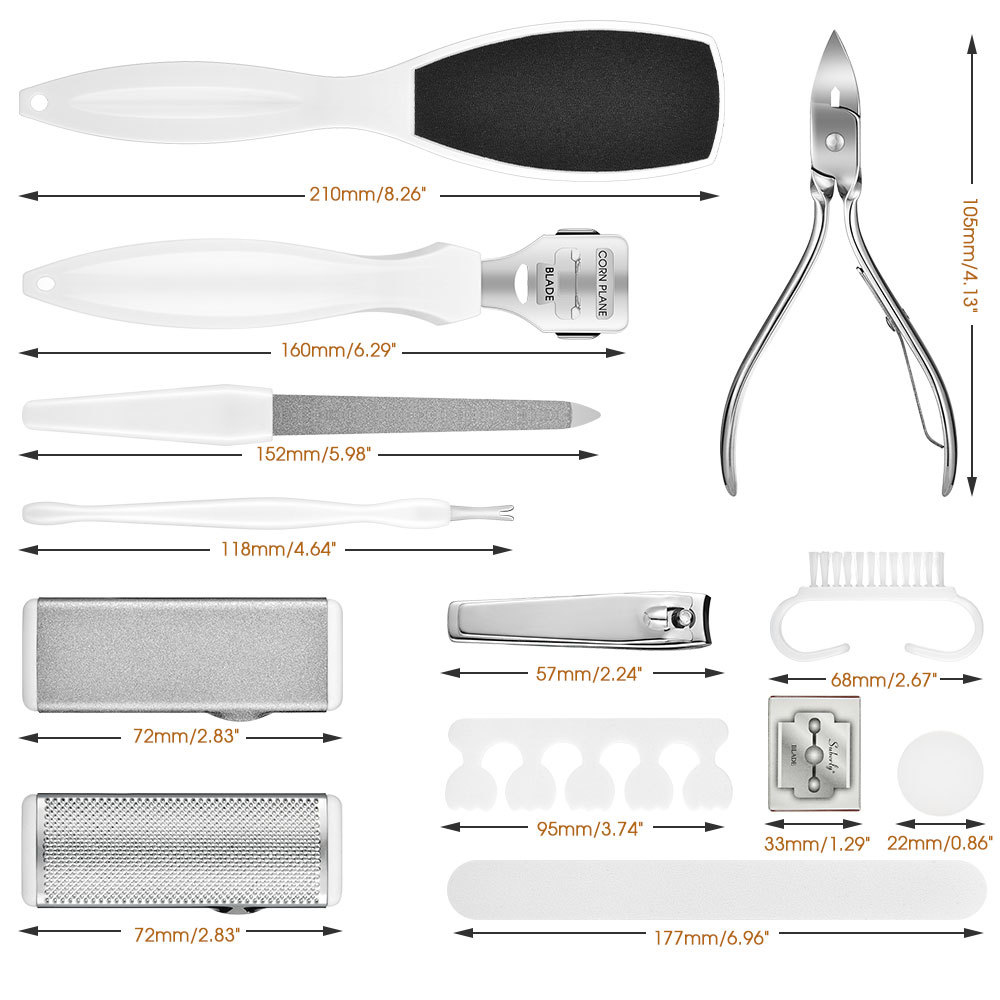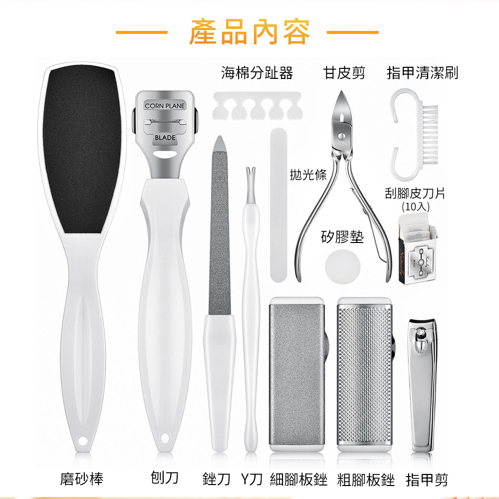 | 內容物 | 磨砂棒x1、刨刀x1、銼刀x1、修皮Y刀x1、細腳板銼x1、粗腳板銼x1、甘皮剪x1 指甲剪x1、指甲清潔刷x1、海棉分趾器x1、刮腳皮刀片(10入)、矽膠墊x1、指甲拋光條x1 |